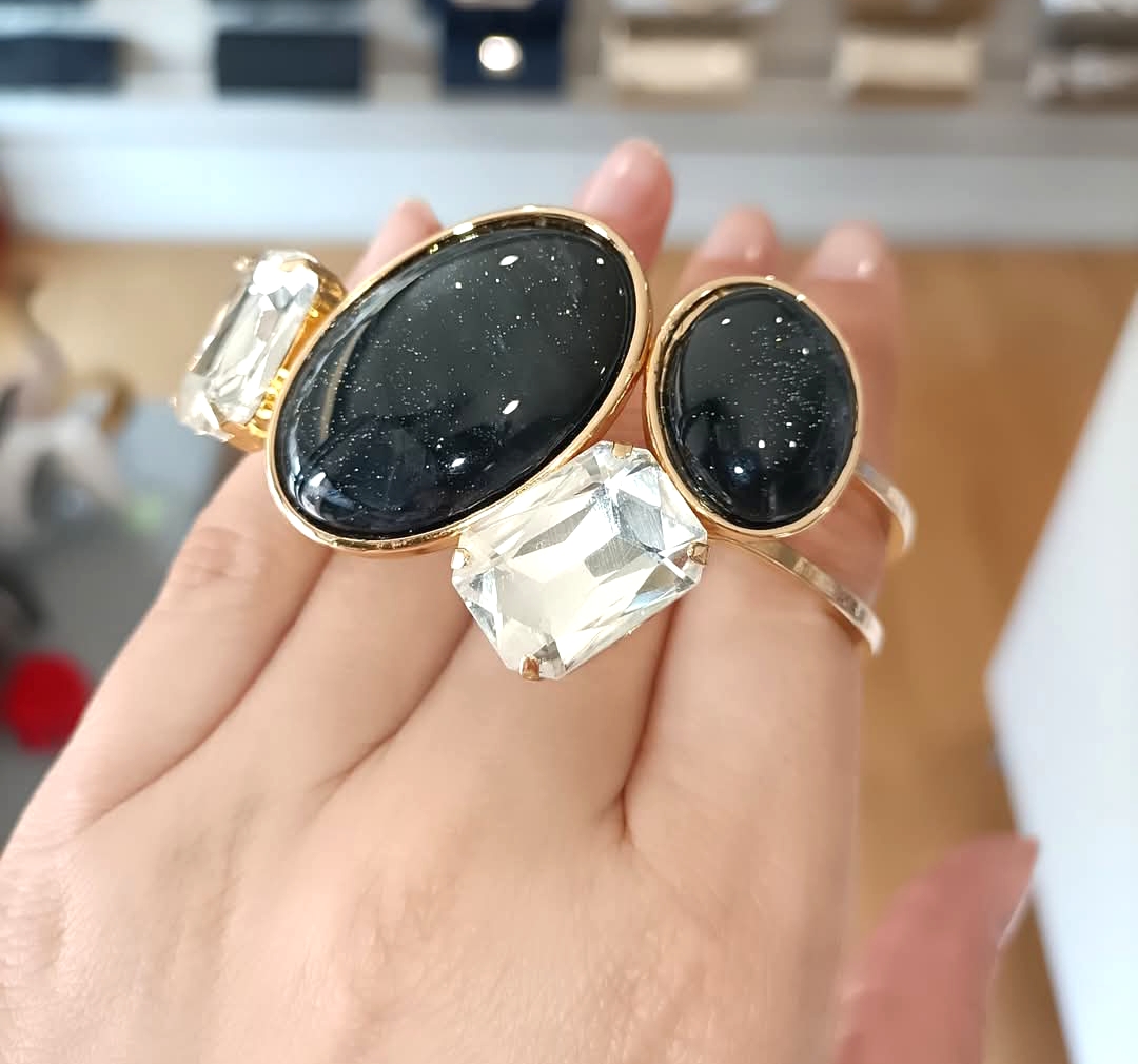 Un bracciale rigido dall’aspetto elegante e appariscente con due pietre nere che fanno da protagoniste.
